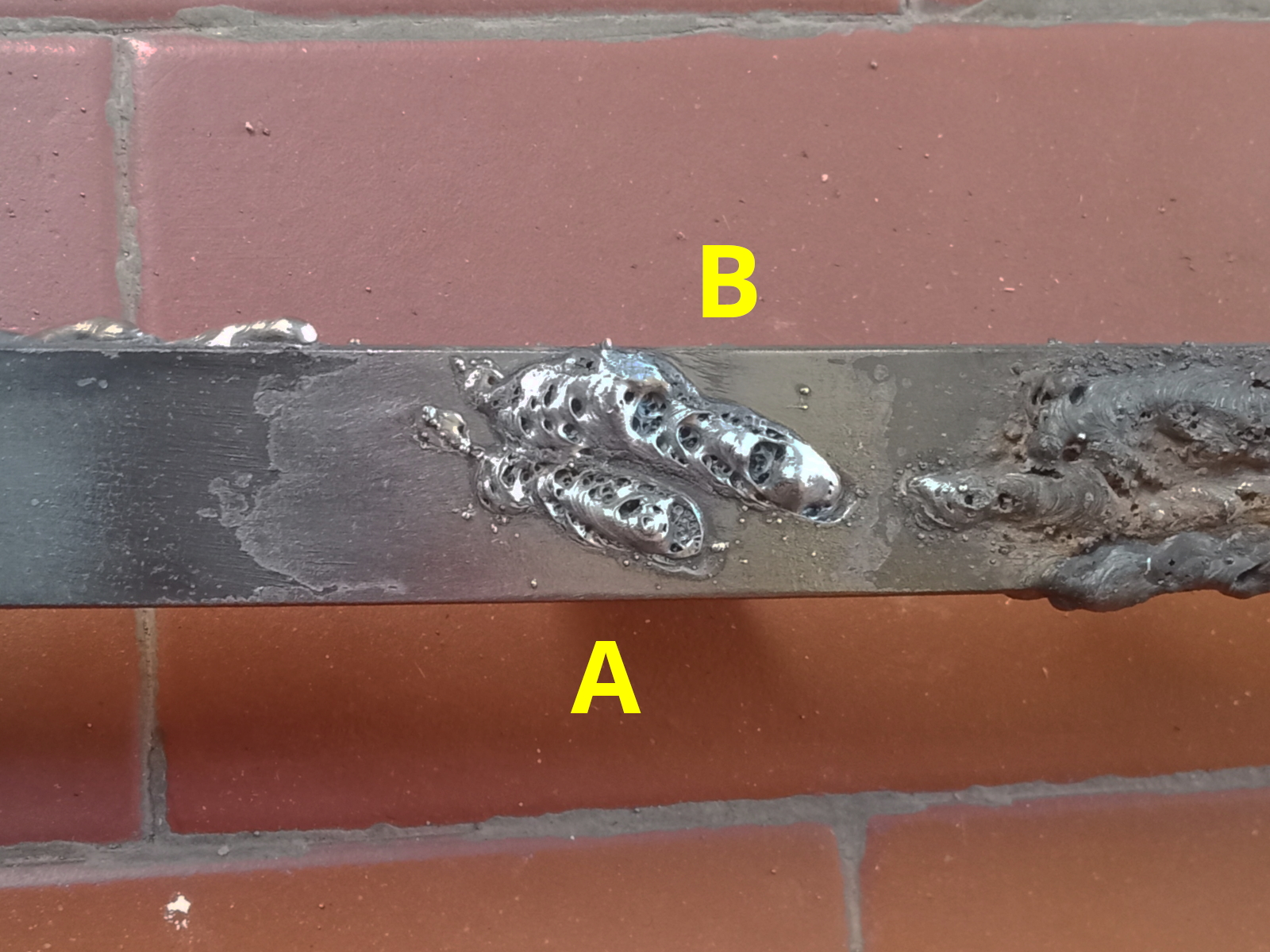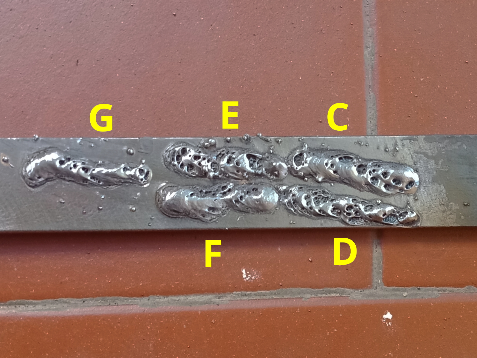 Some (bad) tests on a steel bar, 4 mm thick, with a flux-cored 1.0 mm wire:
